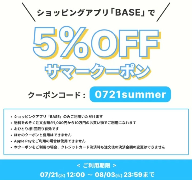 BASEよりクーポンが発行されてます。