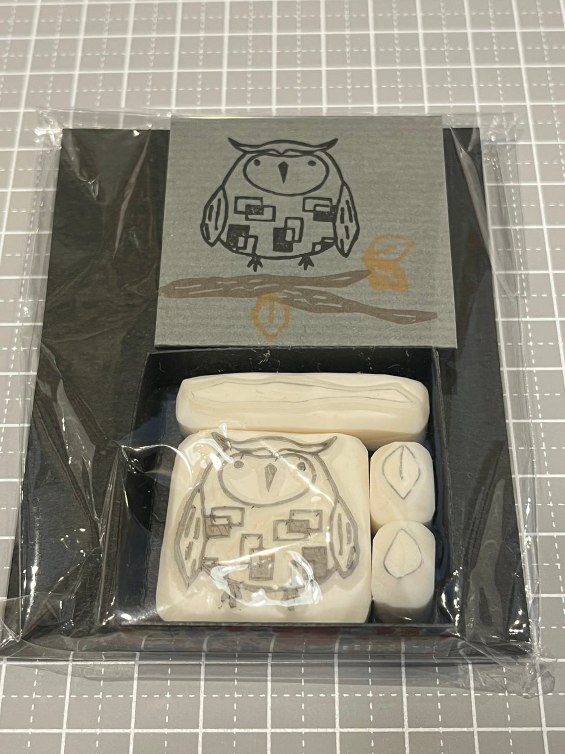 消しゴムはんこ:ふくろうset(BOX入り):木の持ち手なし**消しゴムはんこirodori作品*