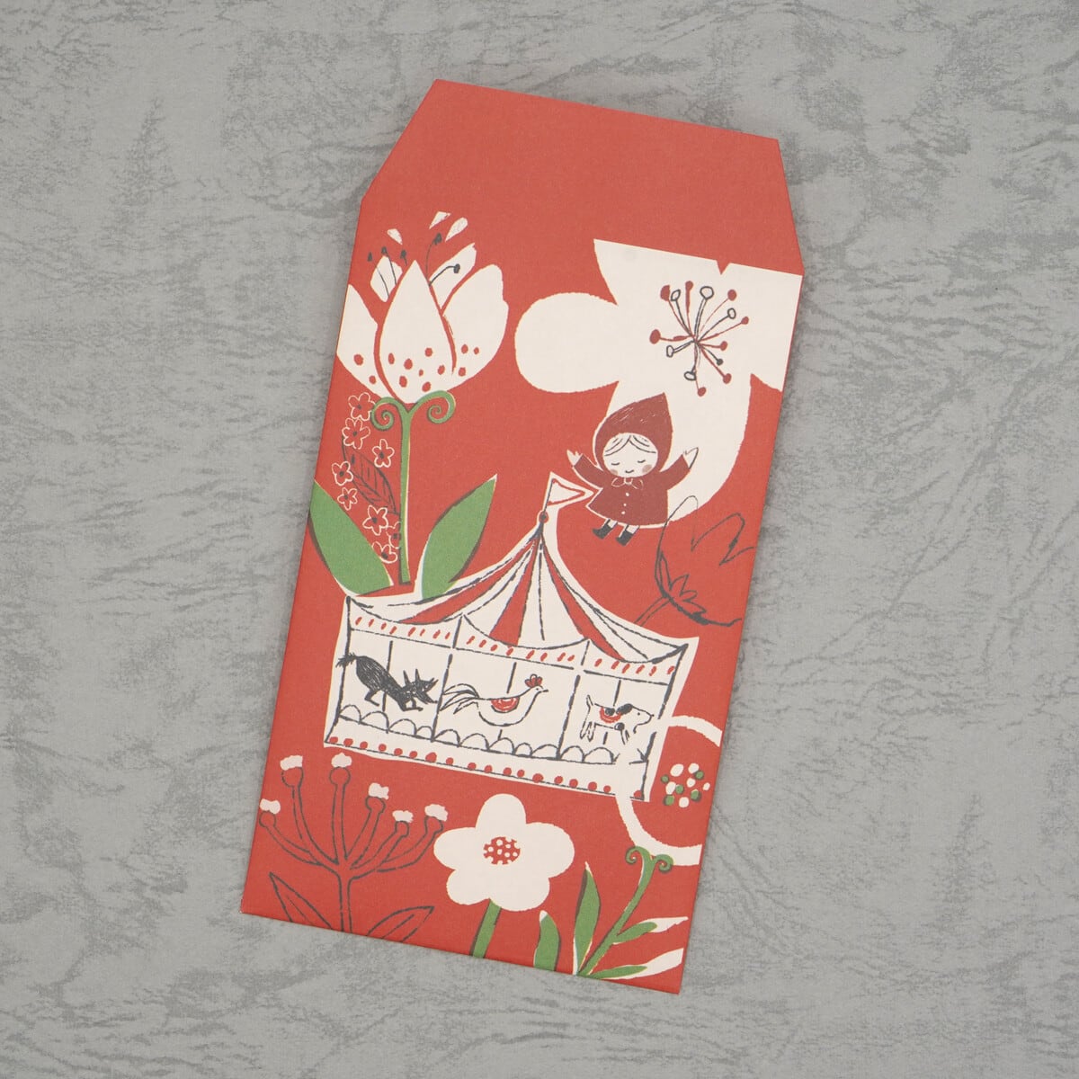 赤いフードをかぶった赤ずきんちゃんと、ちょっぴり悪そうなオオカミのイラストがポイントです まるで童話の世界に迷い込んだような夢見る時間をお届けします