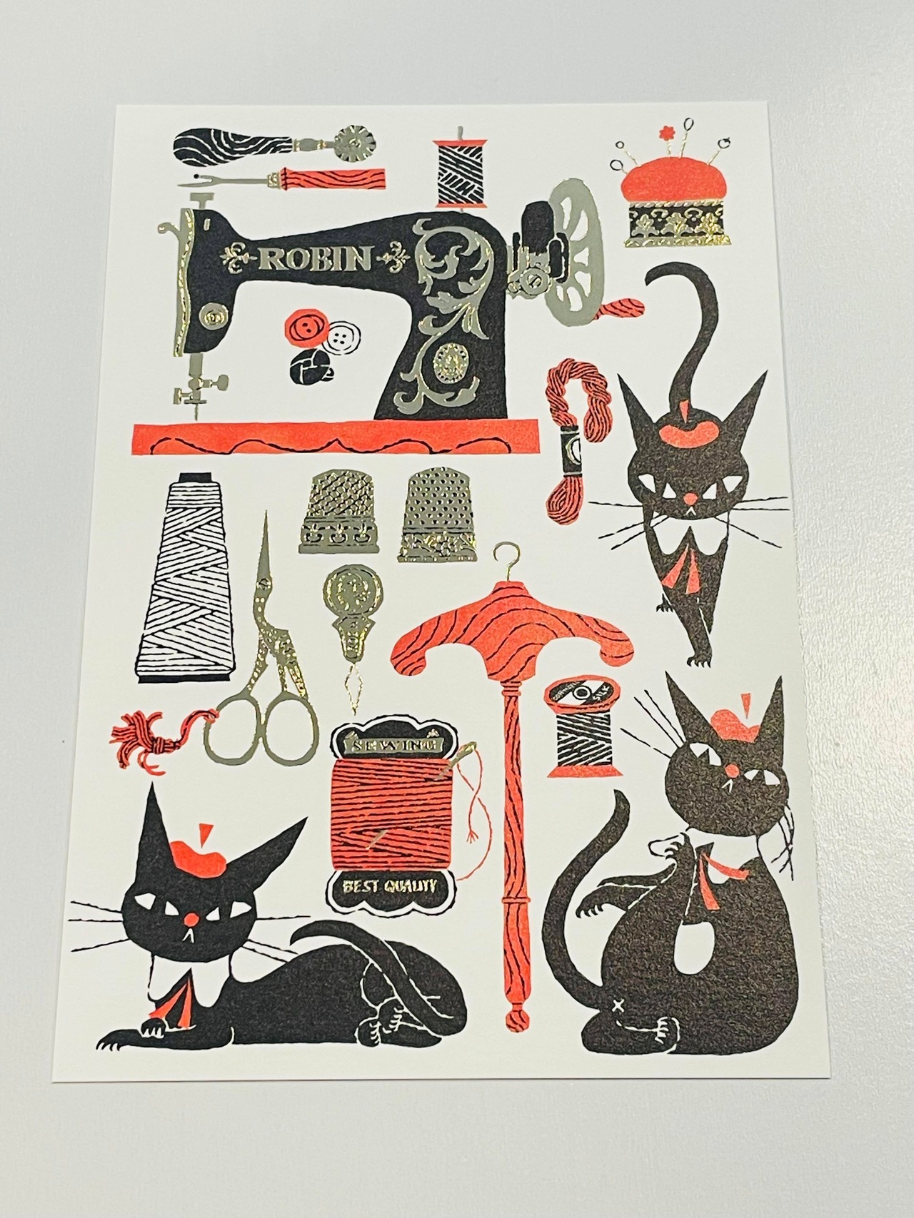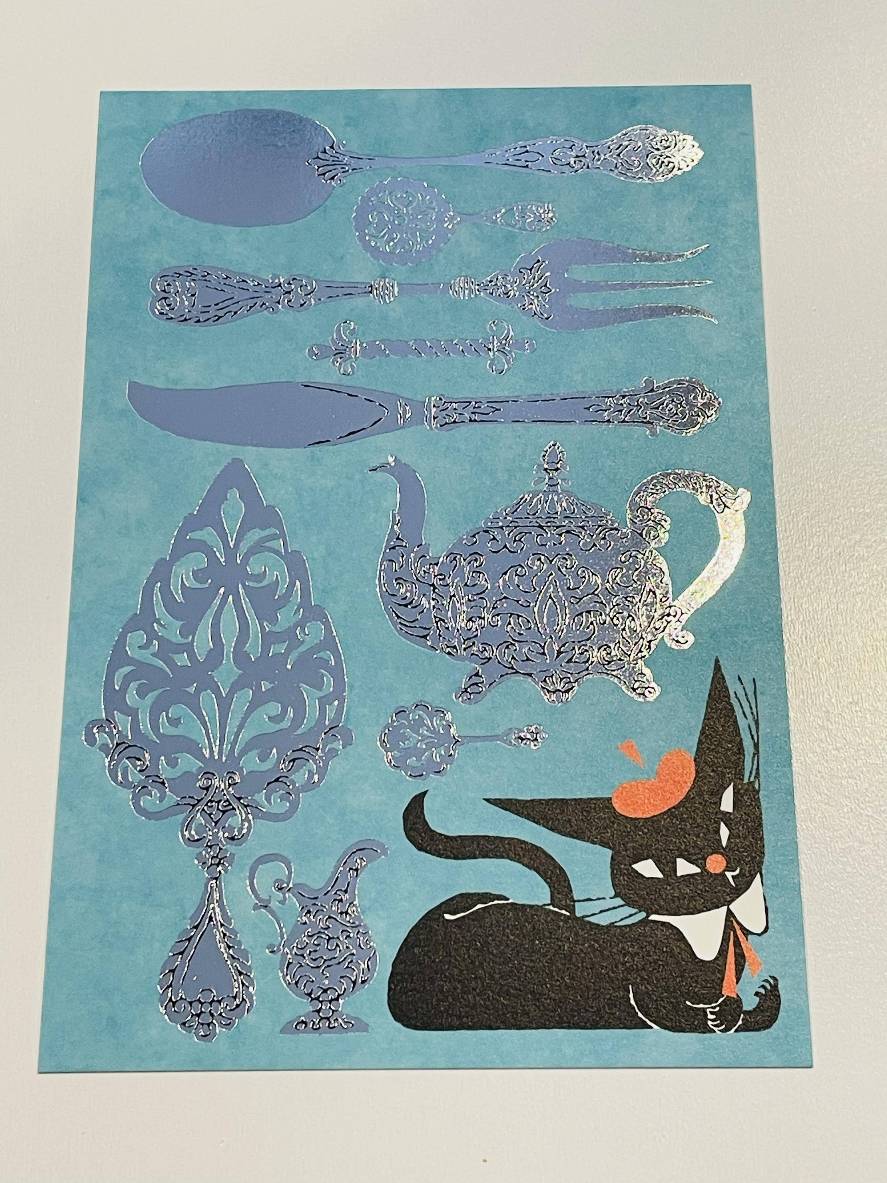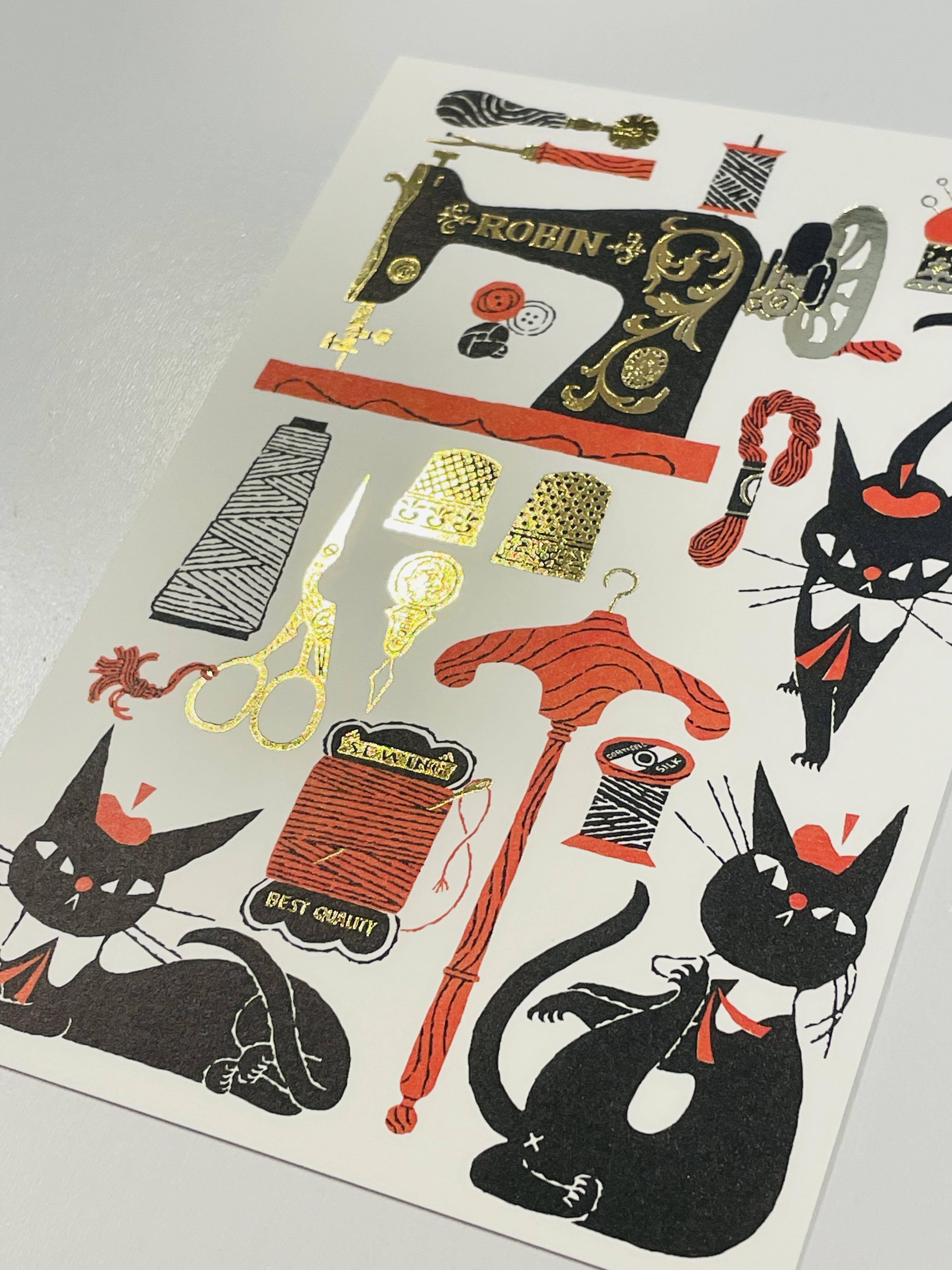 黒ねこ意匠:箔押しポストカード:ソーイング・夜の森・カトラリー**はじける可愛さポップな黒猫**
