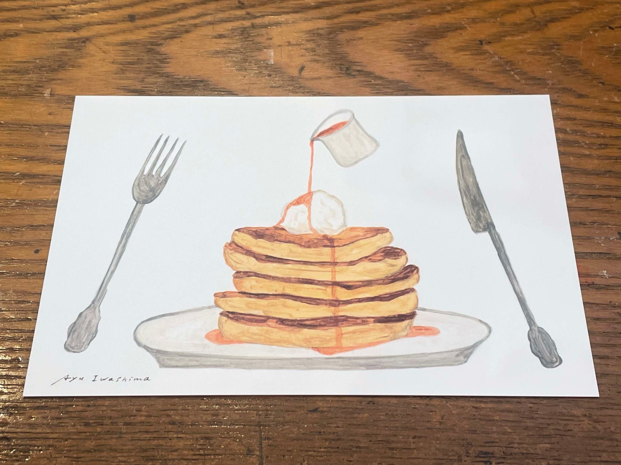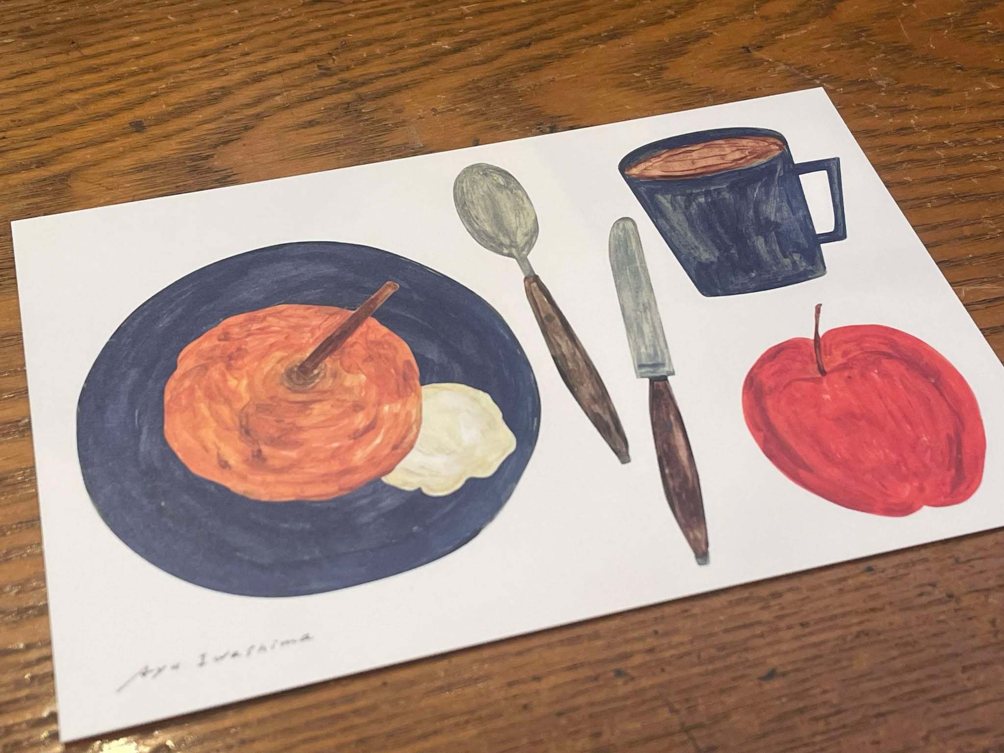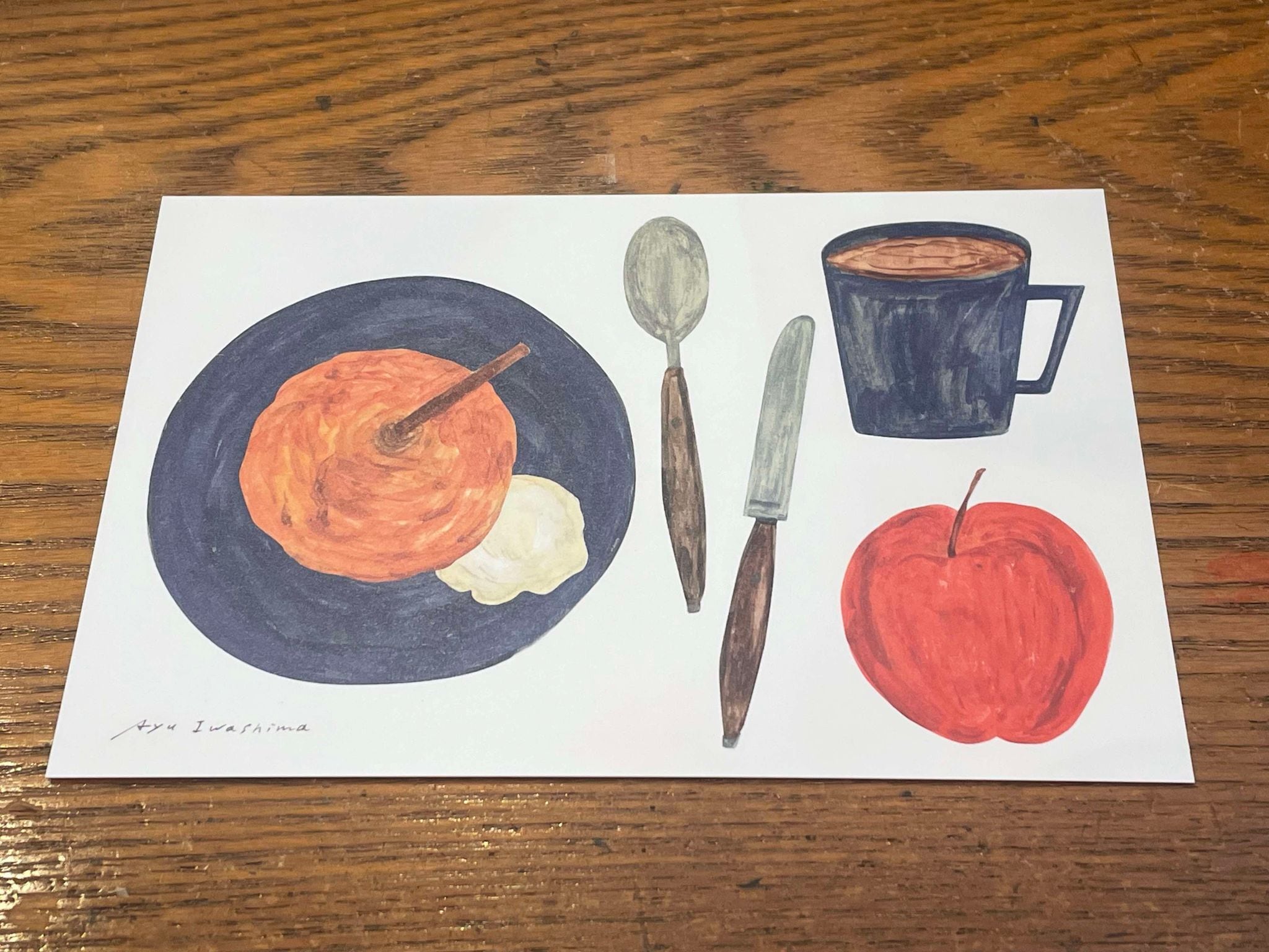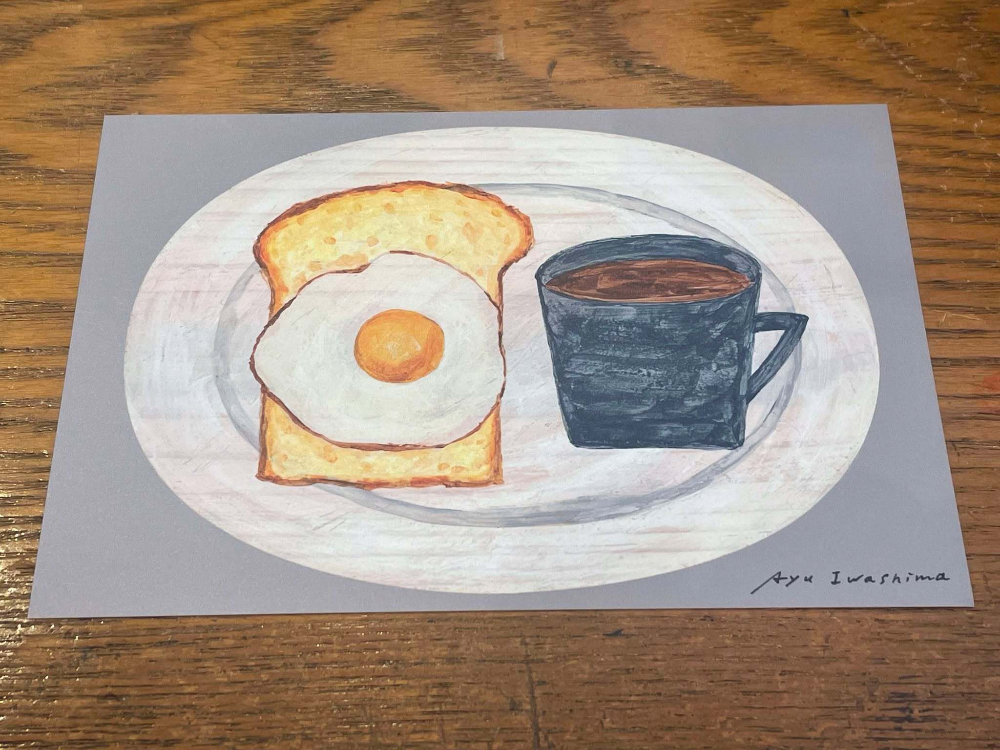 いわしまあゆ:ポストカード:卵トーストとコーヒー・チャイ・グラノーラ・パンケーキ・焼きリンゴ**ホッとするイラストを日常に**